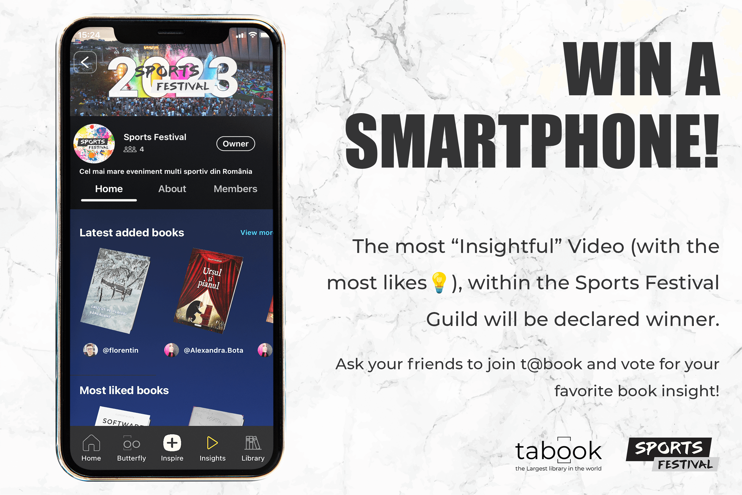 Within our platform, we will launch the Sports Festival Guild. Visitors will have the challenge to win a latest generation smartphone by creating a 90 seconds video about their thoughts and feelings inspired by a book of their choice. Thus, the most "insightful" video (with the most likes💡) at the end of the festival will be the winner. Participants will face competitors in their quest to spark appreciation and invite friends and family to like their video insight. The winner will be judged by a technical committee and the video insight with the most likes will claim the award, the smartphone at the end of the Festival.